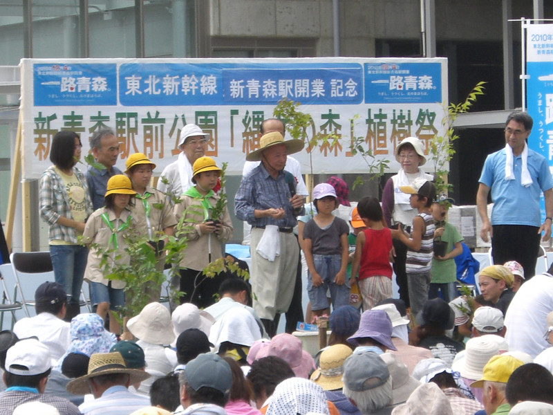 「ねぶた」の始まる8月1日、青森市には北は北海道、南は神戸市から1.500人の市民が集まっていました。大勢の皆さんは今年12月に開業する新青森駅近くで開催された「縄文の森」記念植樹に参加するために参集していました。この森づくりの指導は宮脇昭先生です。宮脇先生は「本物の森は長持ちします。土地本来の木で主役・三役・五役を支える高木から低木までの混植・密植でこの青森に本物の森をつくりましょう」と参加者の皆さんに呼びかけました。