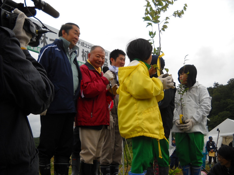 植樹祭は森びと最高顧問の宮脇明先生の指導に基づき、土地本来の広葉樹を中心にした植樹を行うということでした。植樹祭には地元鹿角市の八幡平小学校・八幡平中学校などの小・中生をはじめとして、秋田県を中心に1.562名が参加してくれました。植えた苗木は主木となるブナ・ミズナラなど11種15.000本でした。みちのく事務所からも角岸所長以下6名のスタッフが参加しました。参加された皆さん寒い中ご苦労様でした。