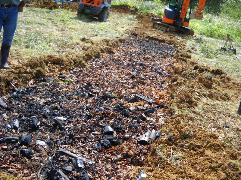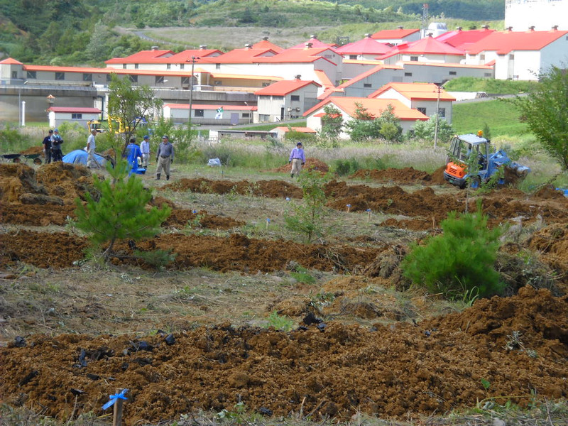 4日は朝から晴れ間も見える天候となり、作業はほぼ順調に進みました。穴を掘り、そこへバーク堆肥やバークチップ、腐葉土、炭を入れ、その上に重機で改良用の土を入れてその畝は完了です。土壌の撹乱は来春行う予定です。土壌改良は前日の台風の影響で約3分の1ほど残りました。これも撹乱の時期と合わせて行うこととしました。来年は3.000本植える予定です。